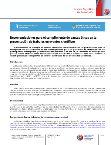 pautas éticas en la presentación de trabajos en Págs. 77 / 78 de Hemoterapia,